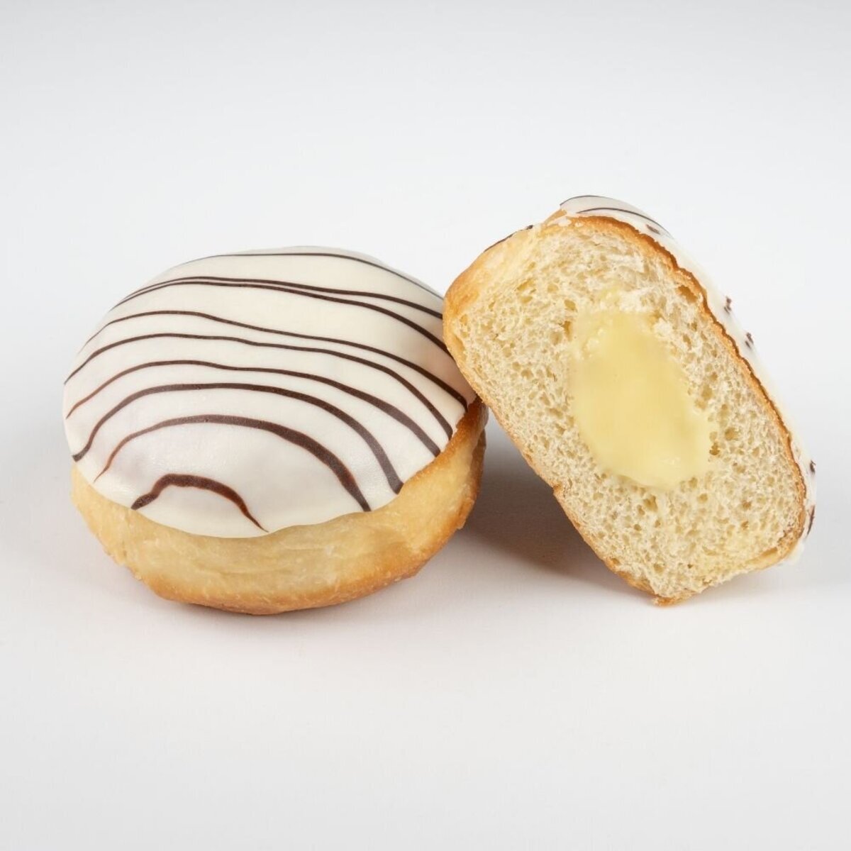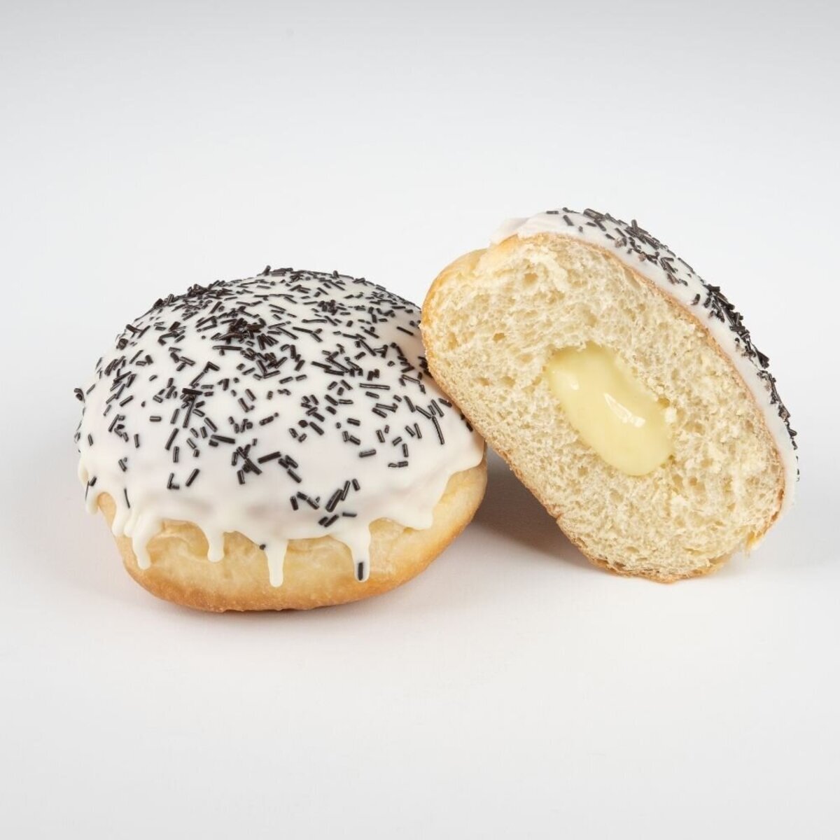 Außen erkennst du sie an der weißen Schokoglasur mit Schokostreuseln. Gefüllt ist die Krapfenvariation mit original Herr Friedrich Eierlikör.